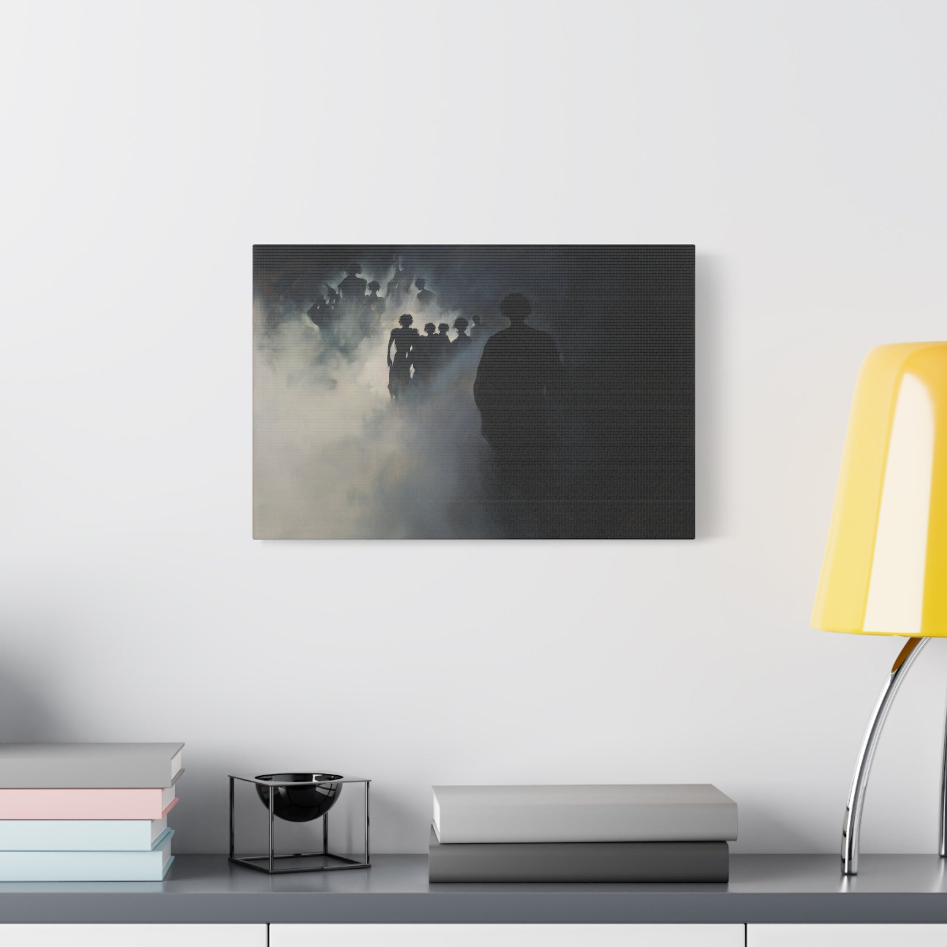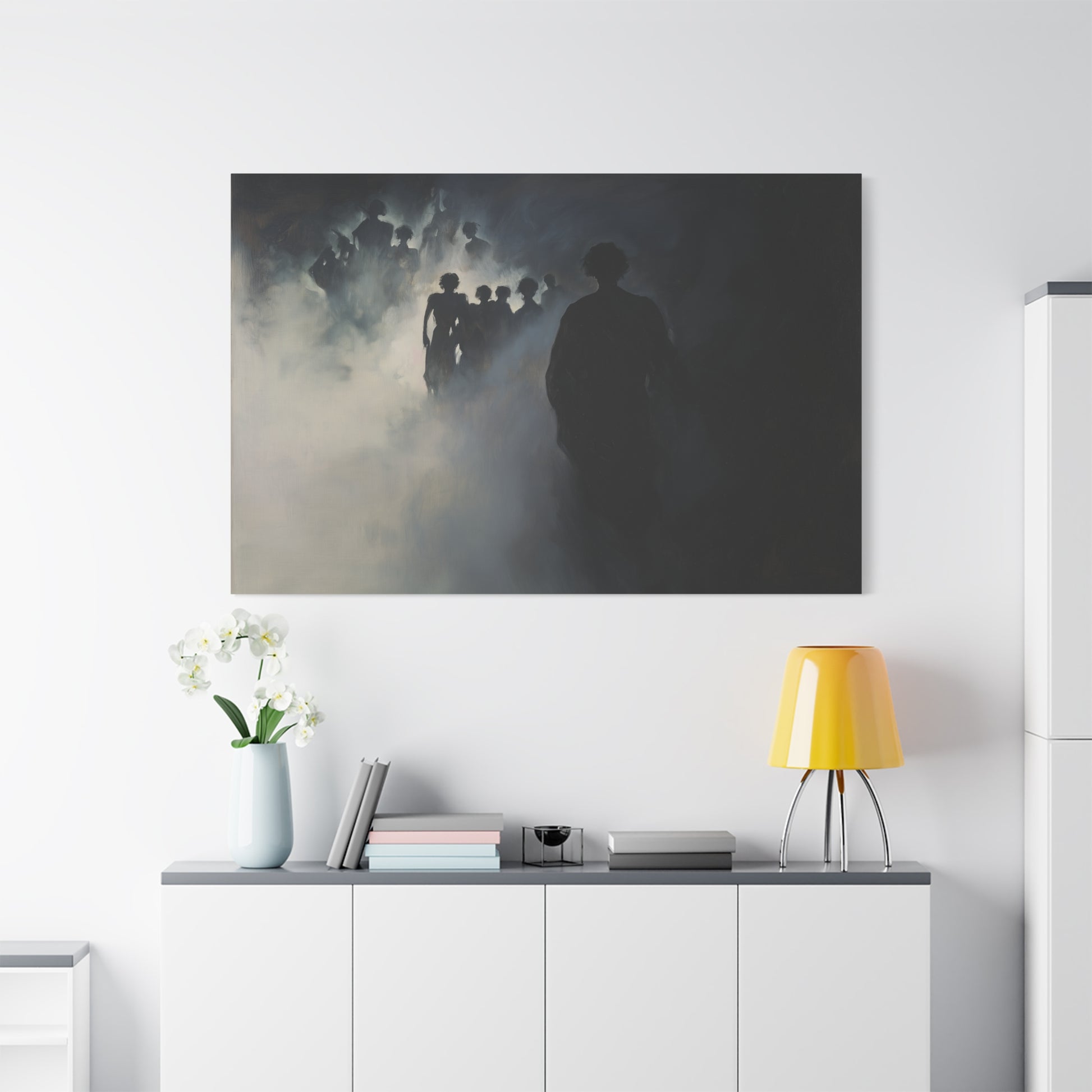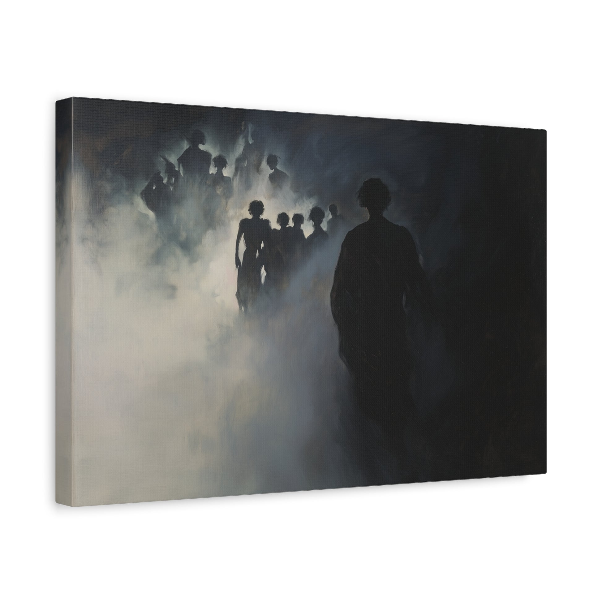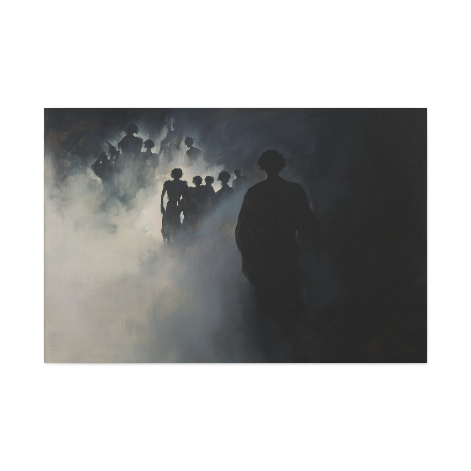 In the enveloping mist, silhouettes emerge and dissolve, whispering secrets of forgotten realms. A haunting dance of shadows beckons, inviting the viewer to wander through veils of memory and mystery.