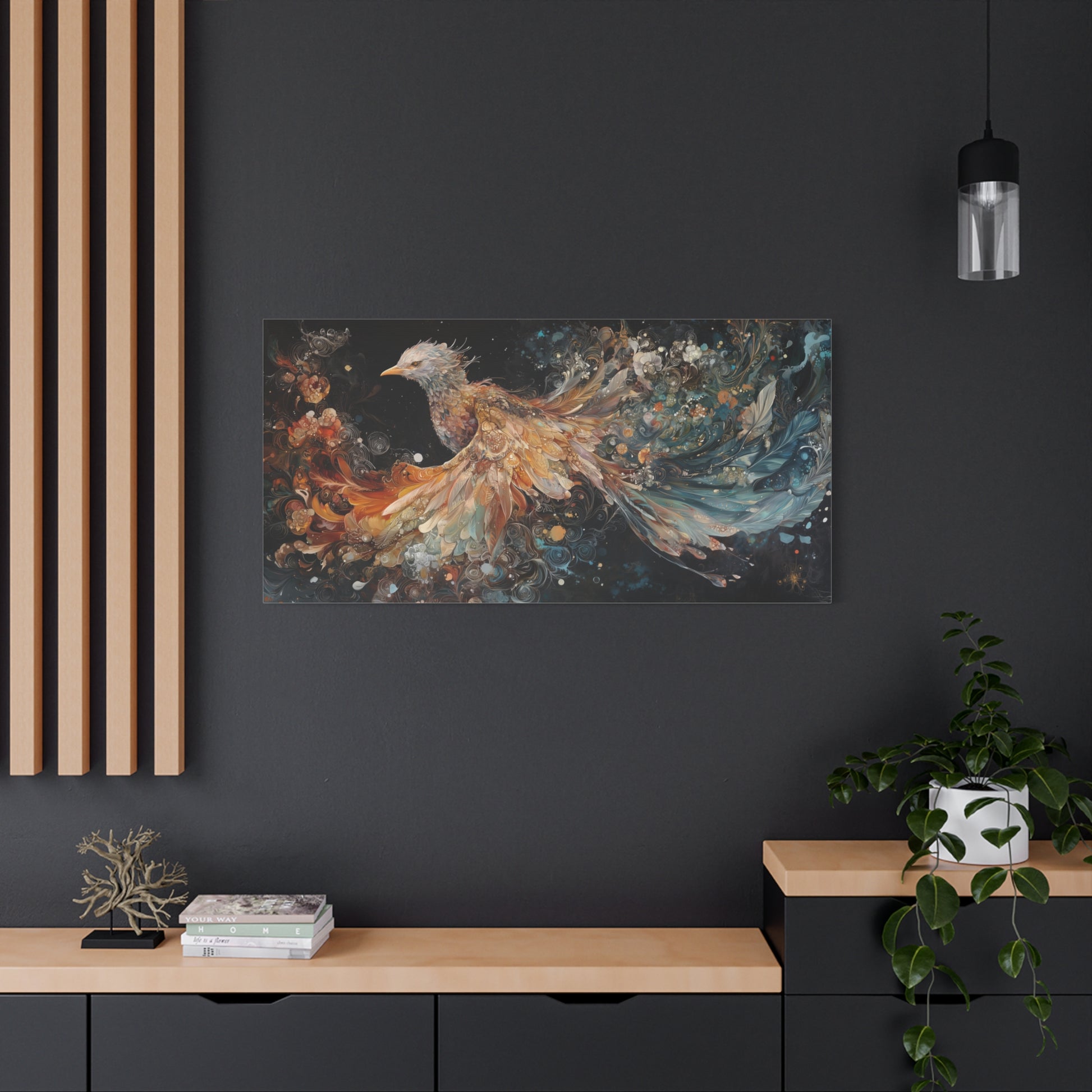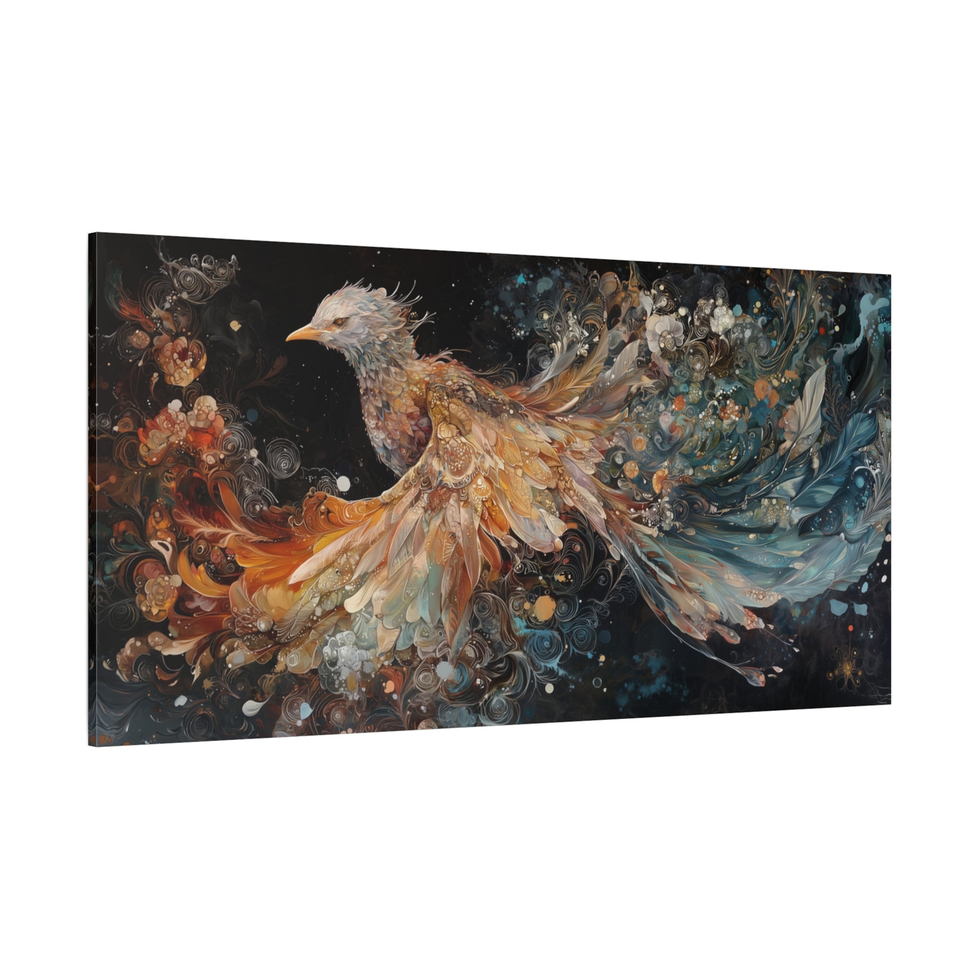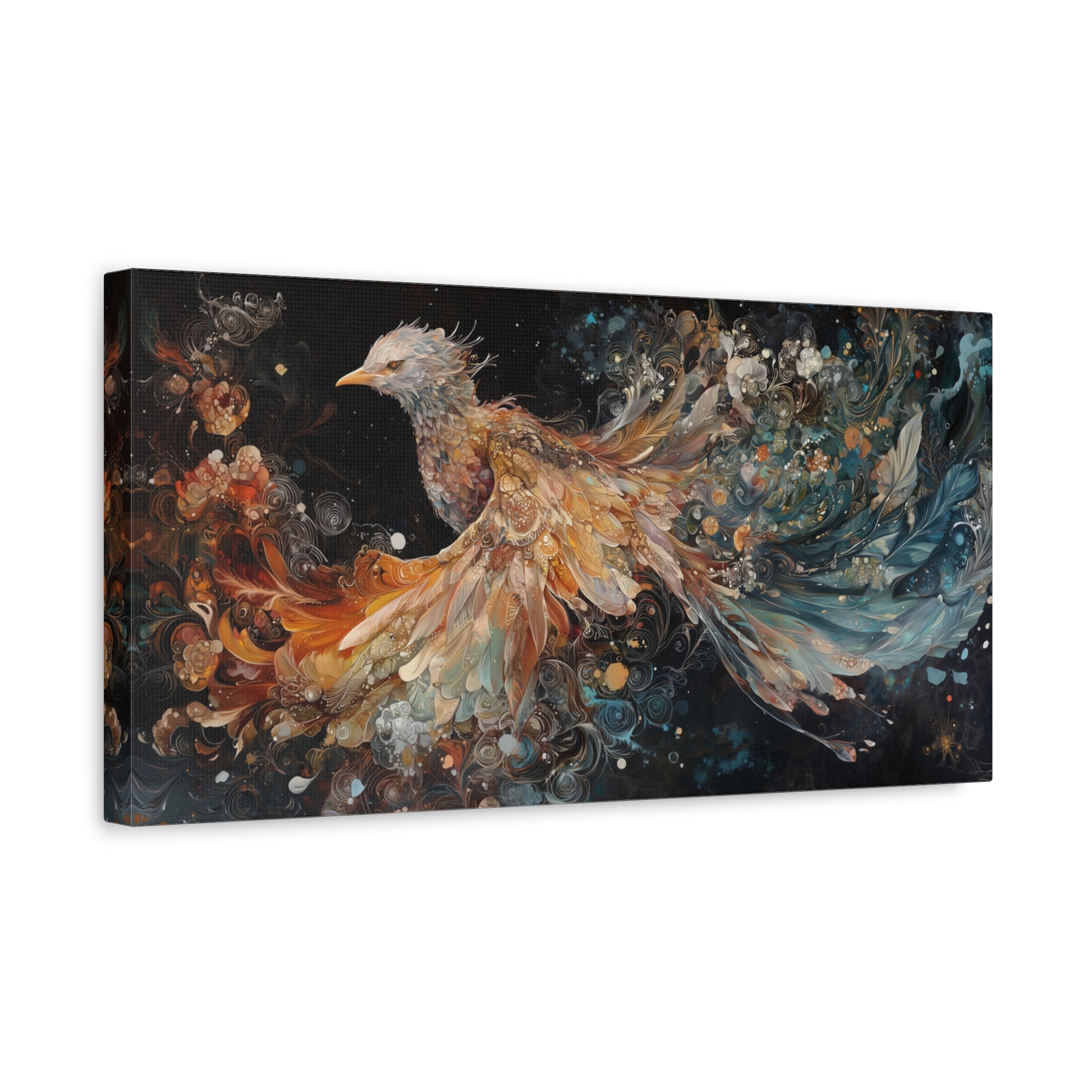 A celestial bird unfurls its iridescent wings, weaving through the cosmic tapestry of dreams and stardust. The swirling colors dance in a harmonious symphony, inviting the viewer to soar beyond the mundane into the realm of wonder.