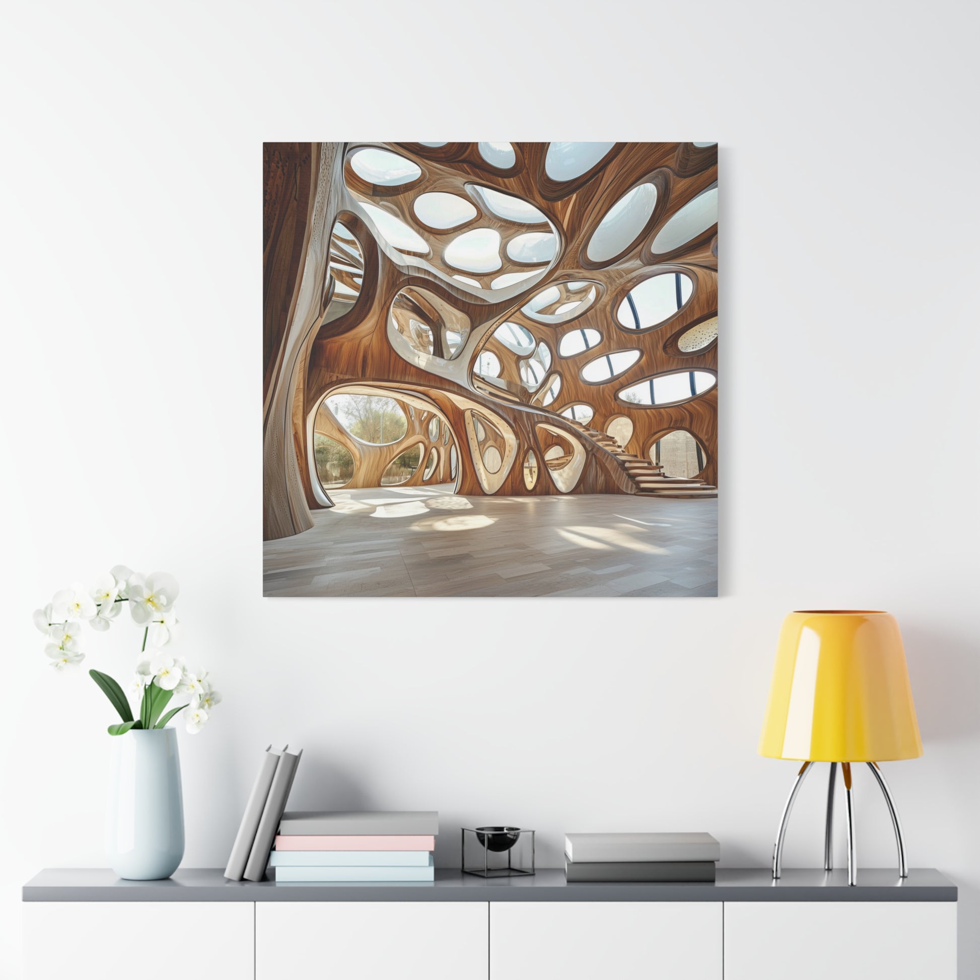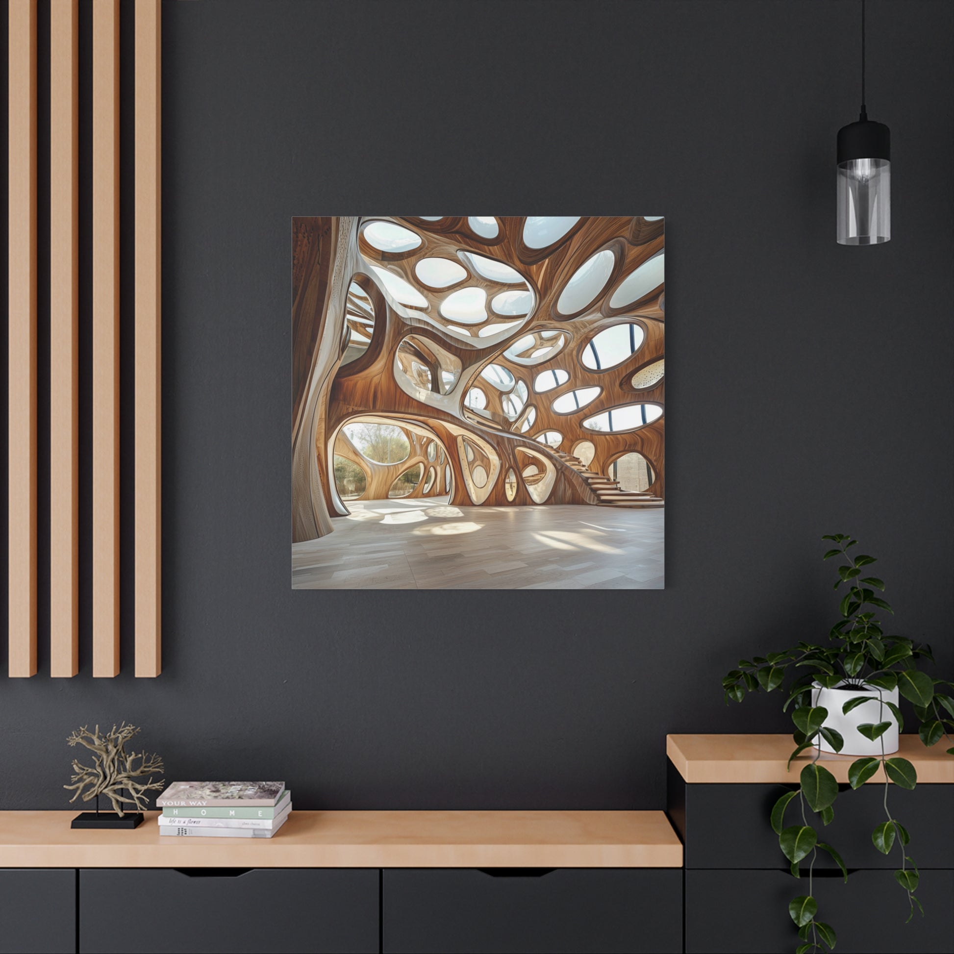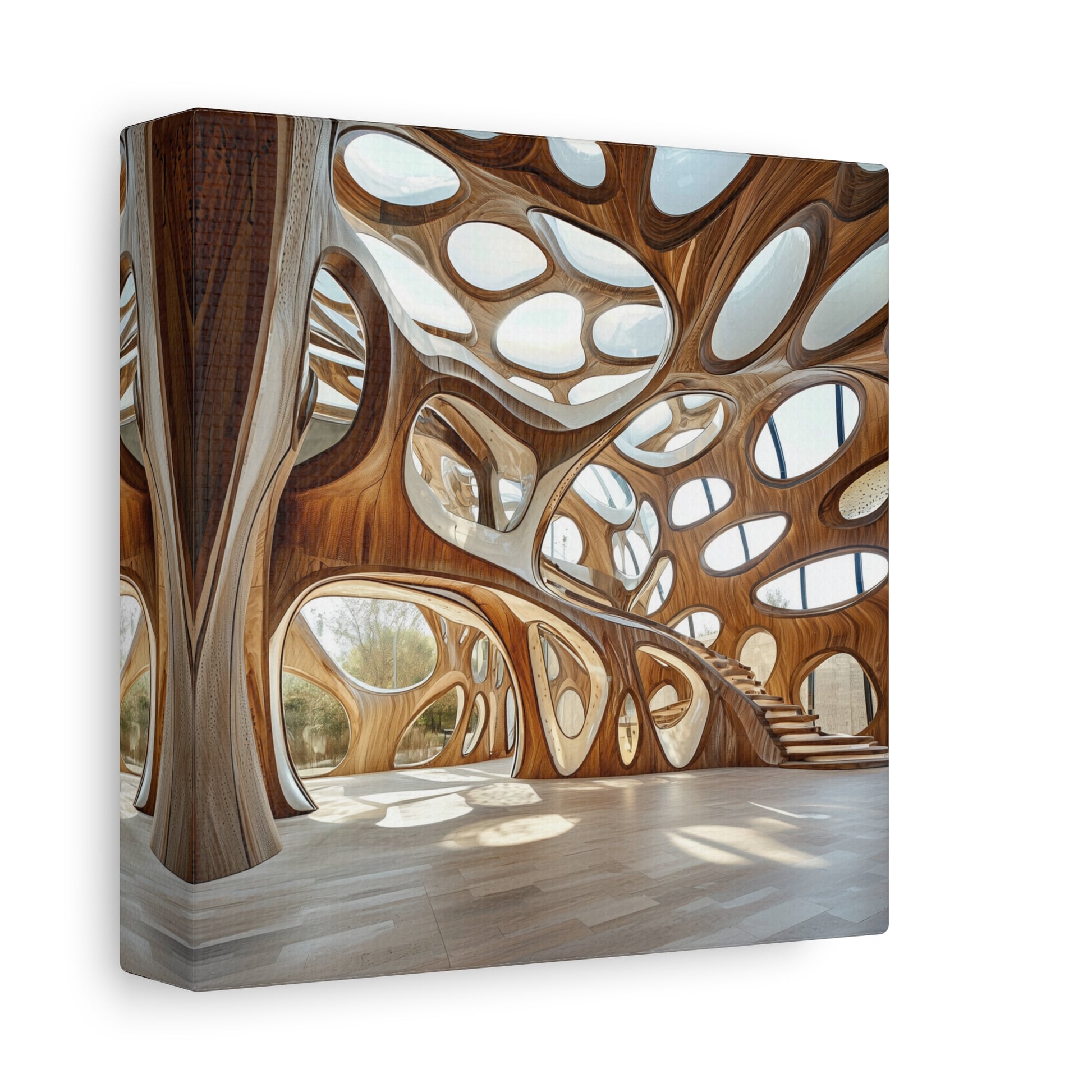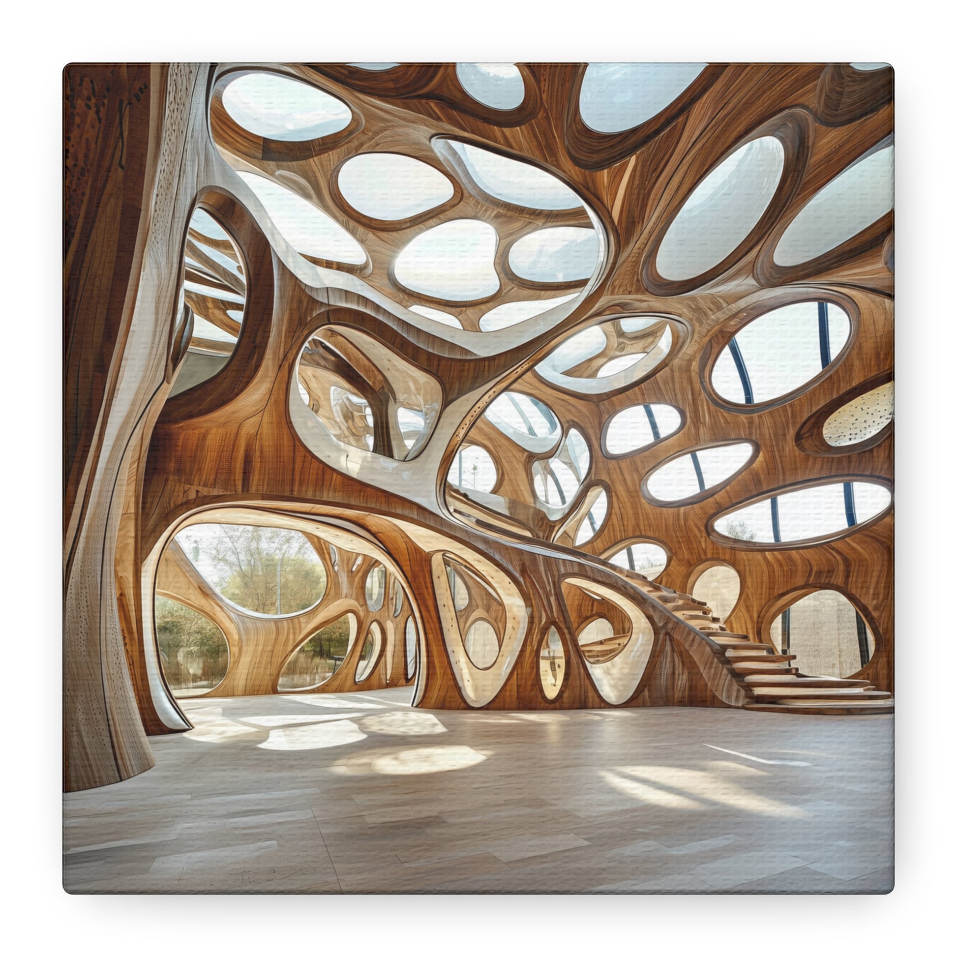 An organic cathedral of flowing light and wood, this space invites contemplation and wonder. Its curves and shadows create a symphony of movement, echoing the eternal dance between nature and human imagination.
