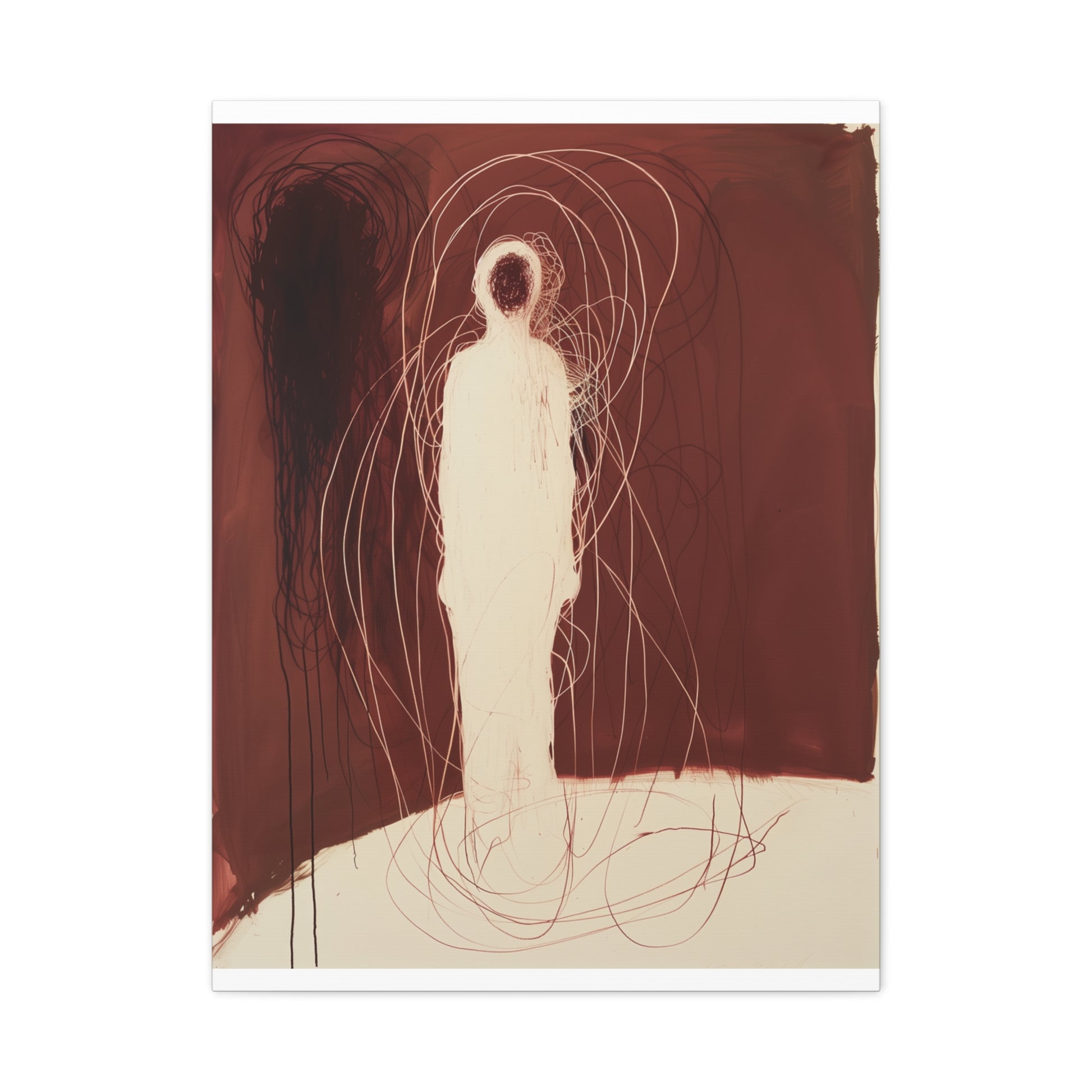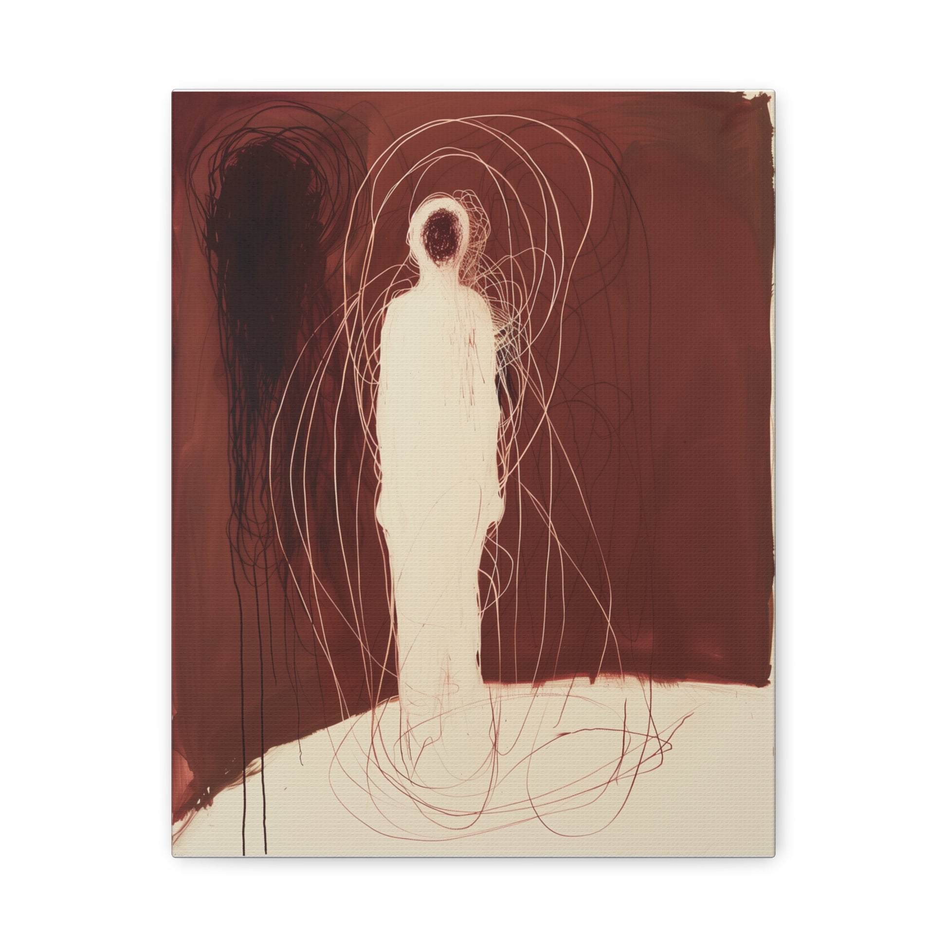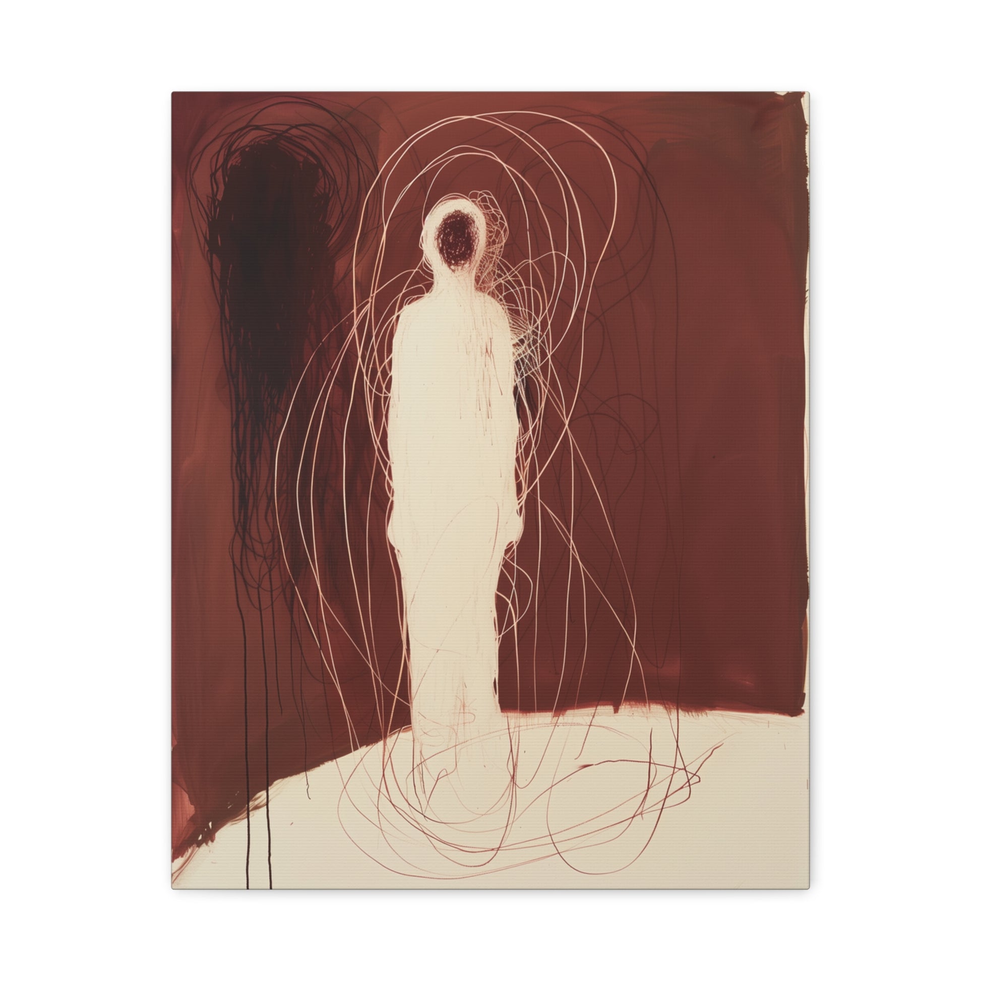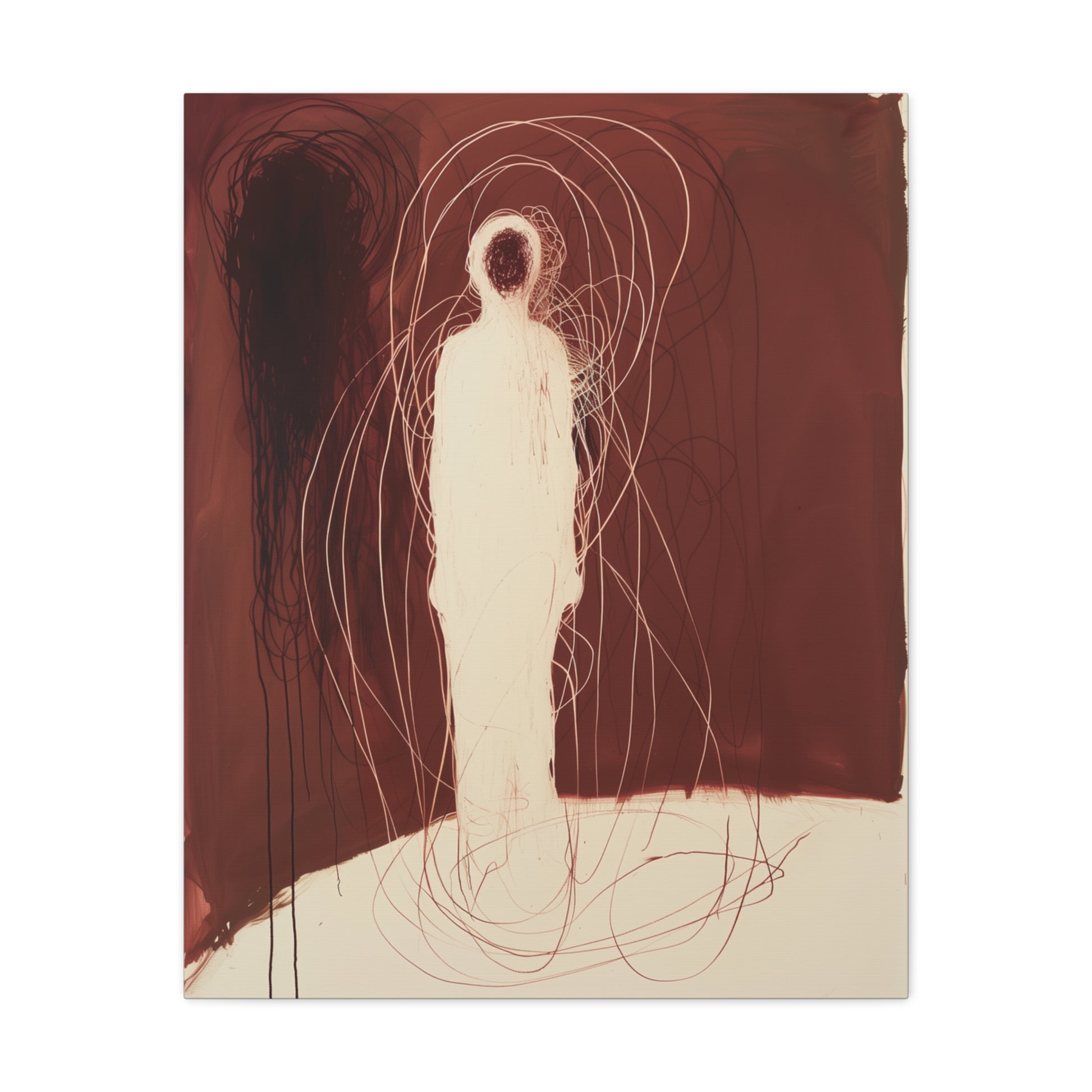 A spectral figure stands ensnared in a web of crimson threads, whispering secrets of shadows and silence. The tension between light and dark invites contemplation, drawing the viewer into its haunting embrace.