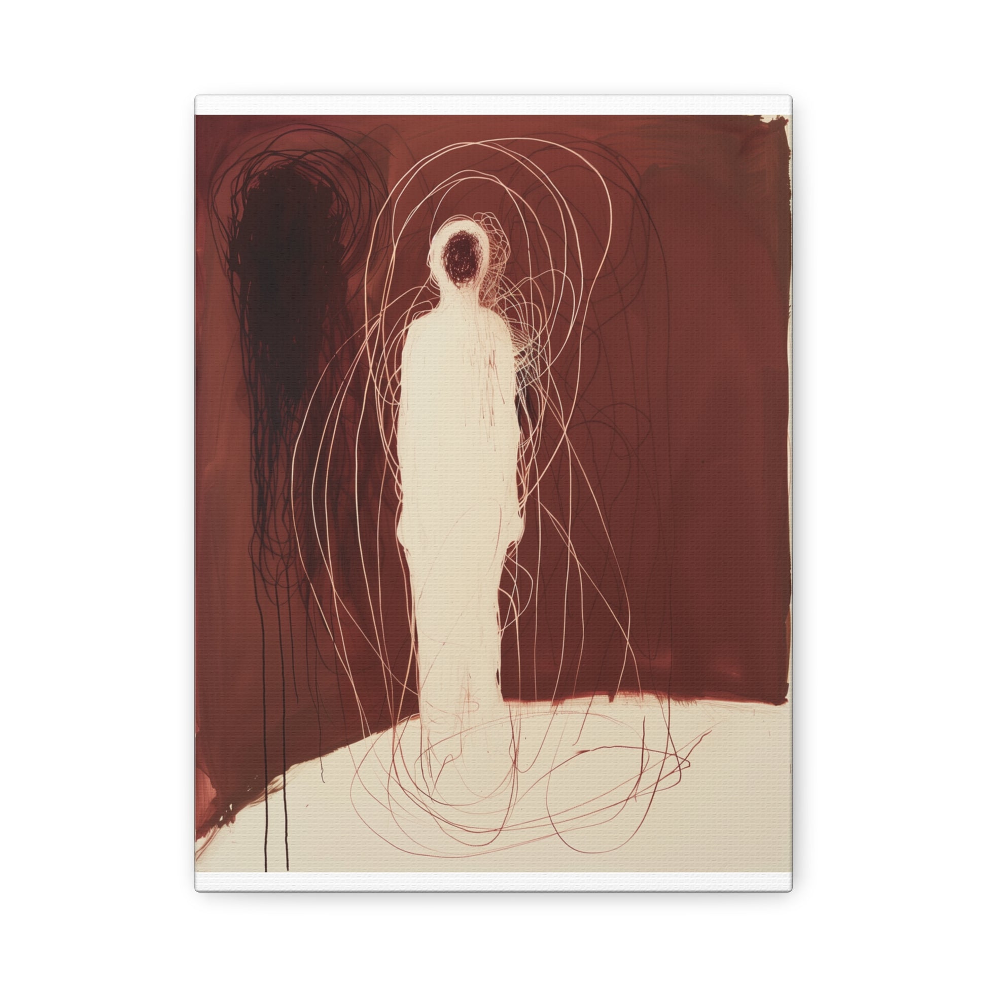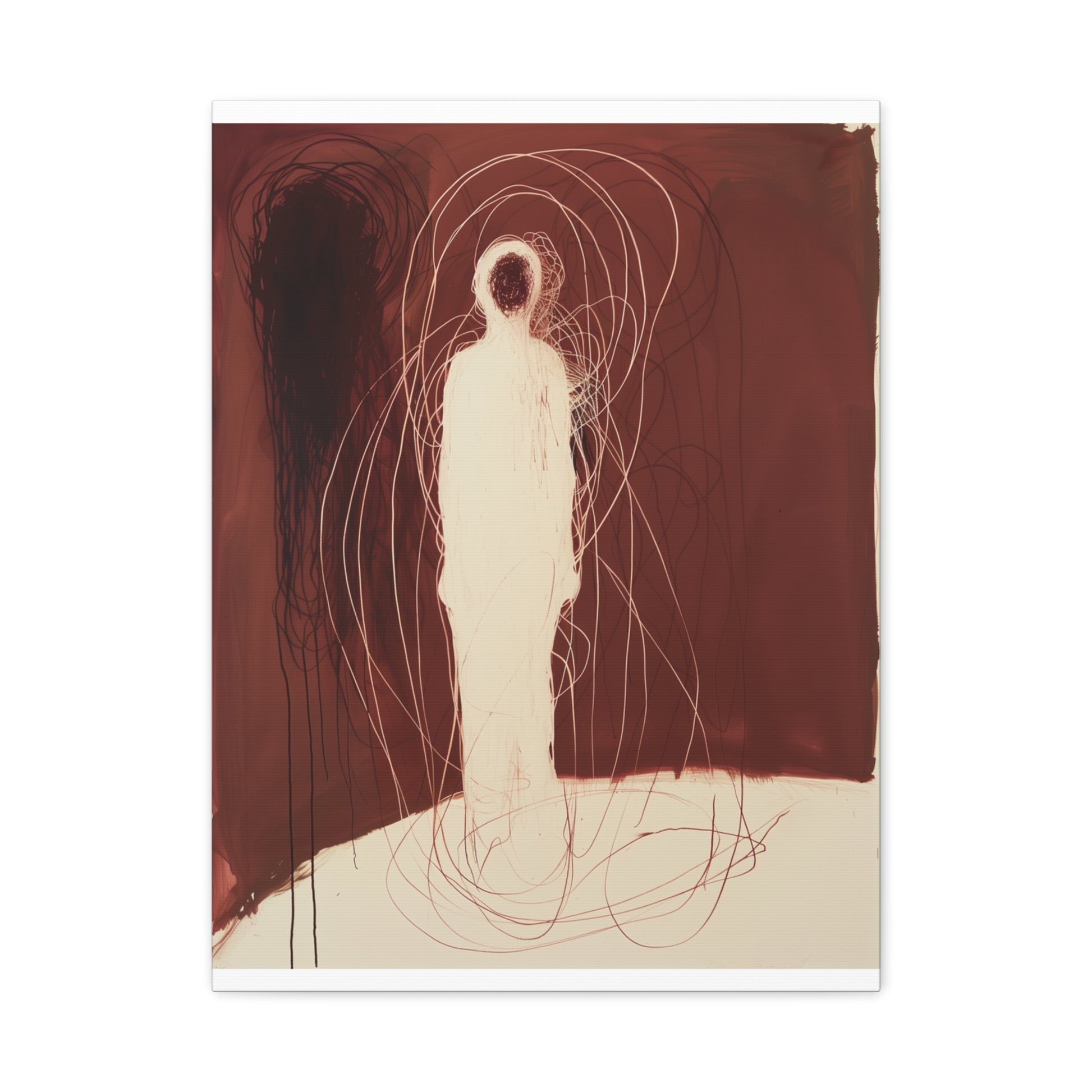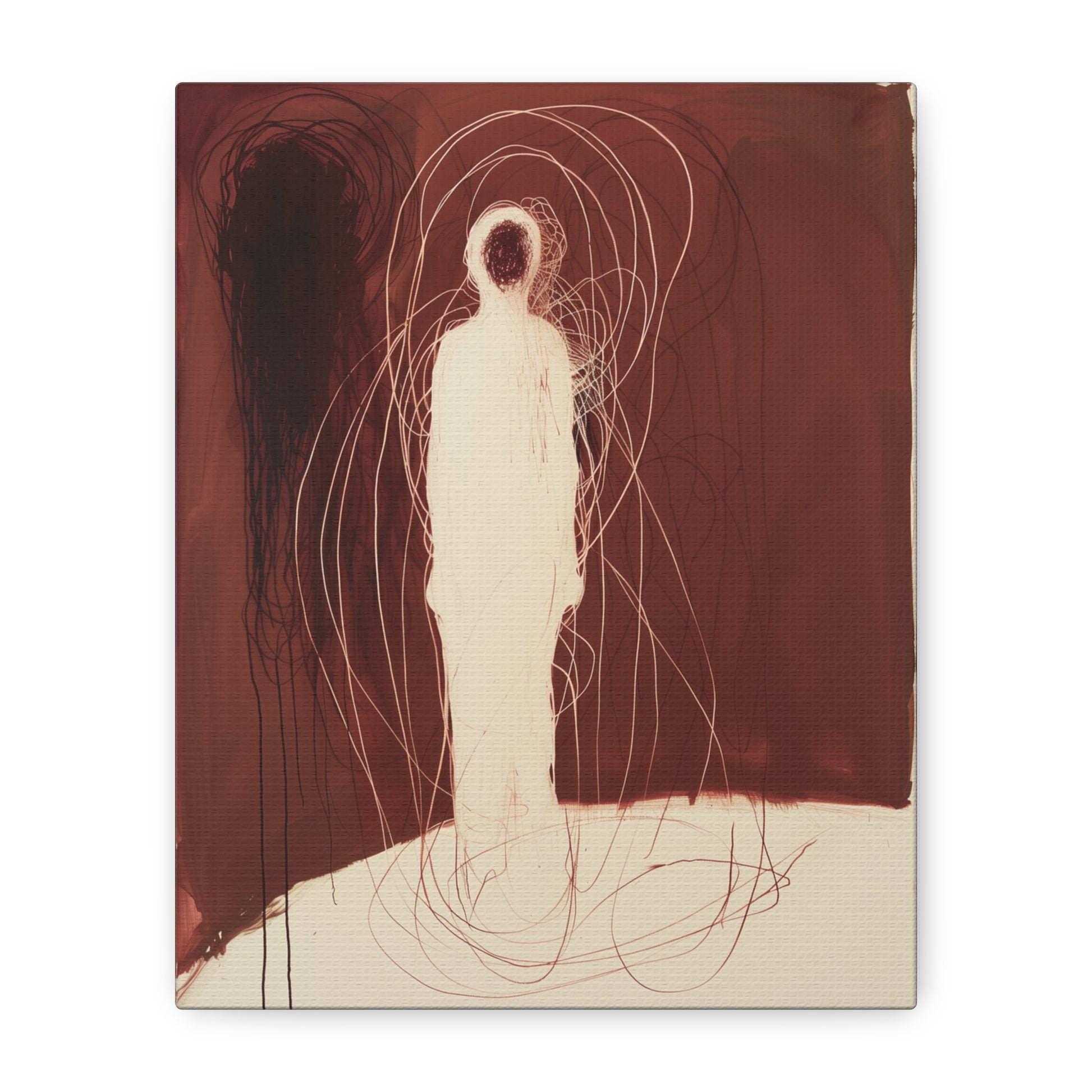 A spectral figure stands ensnared in a web of crimson threads, whispering secrets of shadows and silence. The tension between light and dark invites contemplation, drawing the viewer into its haunting embrace.