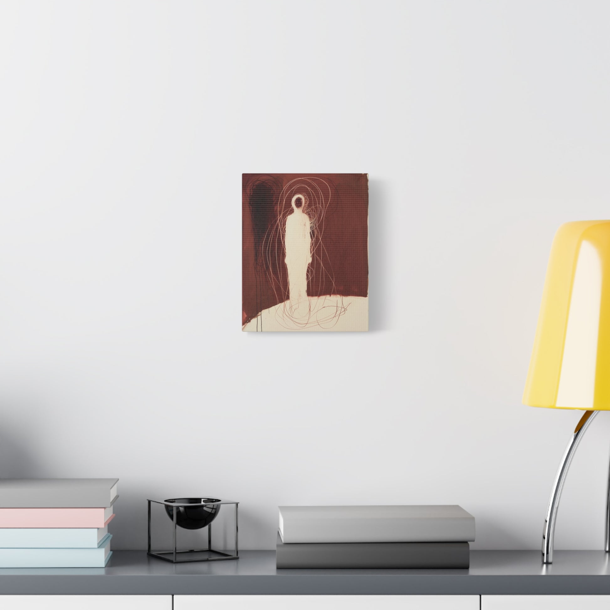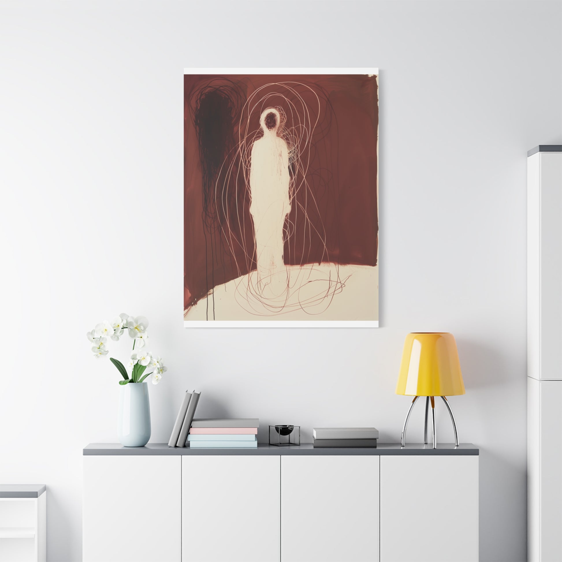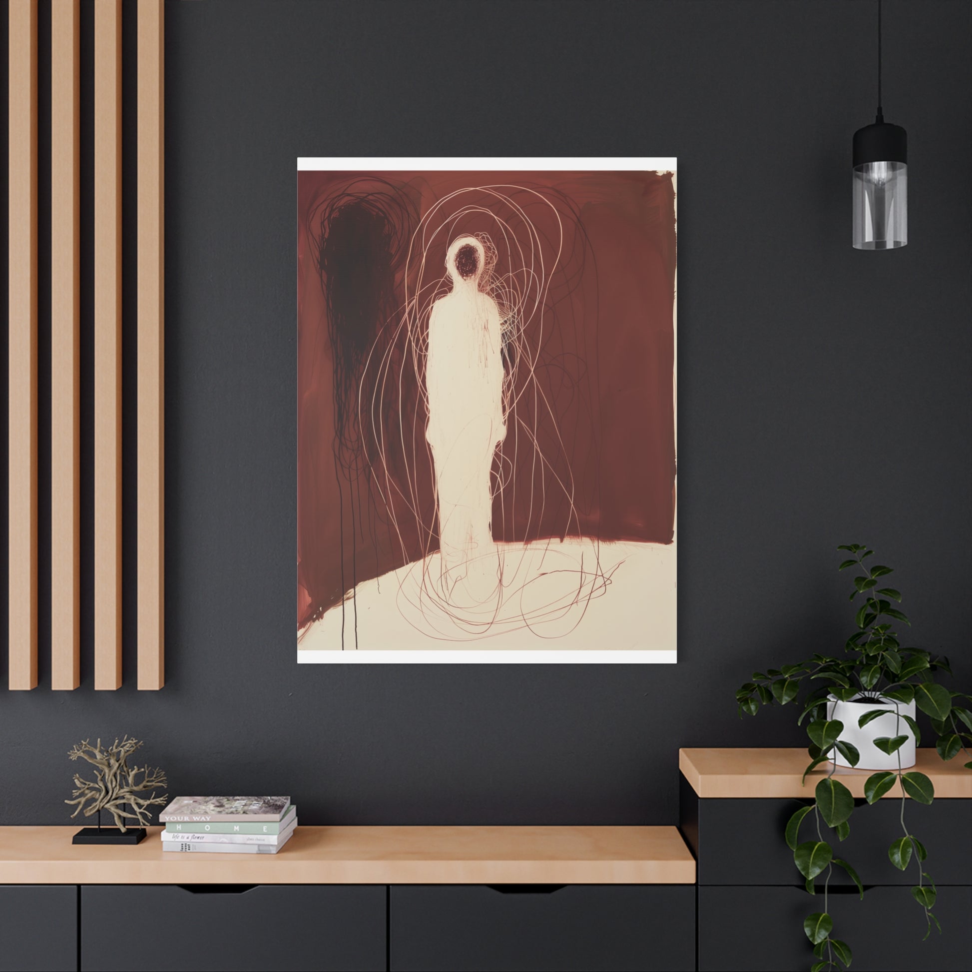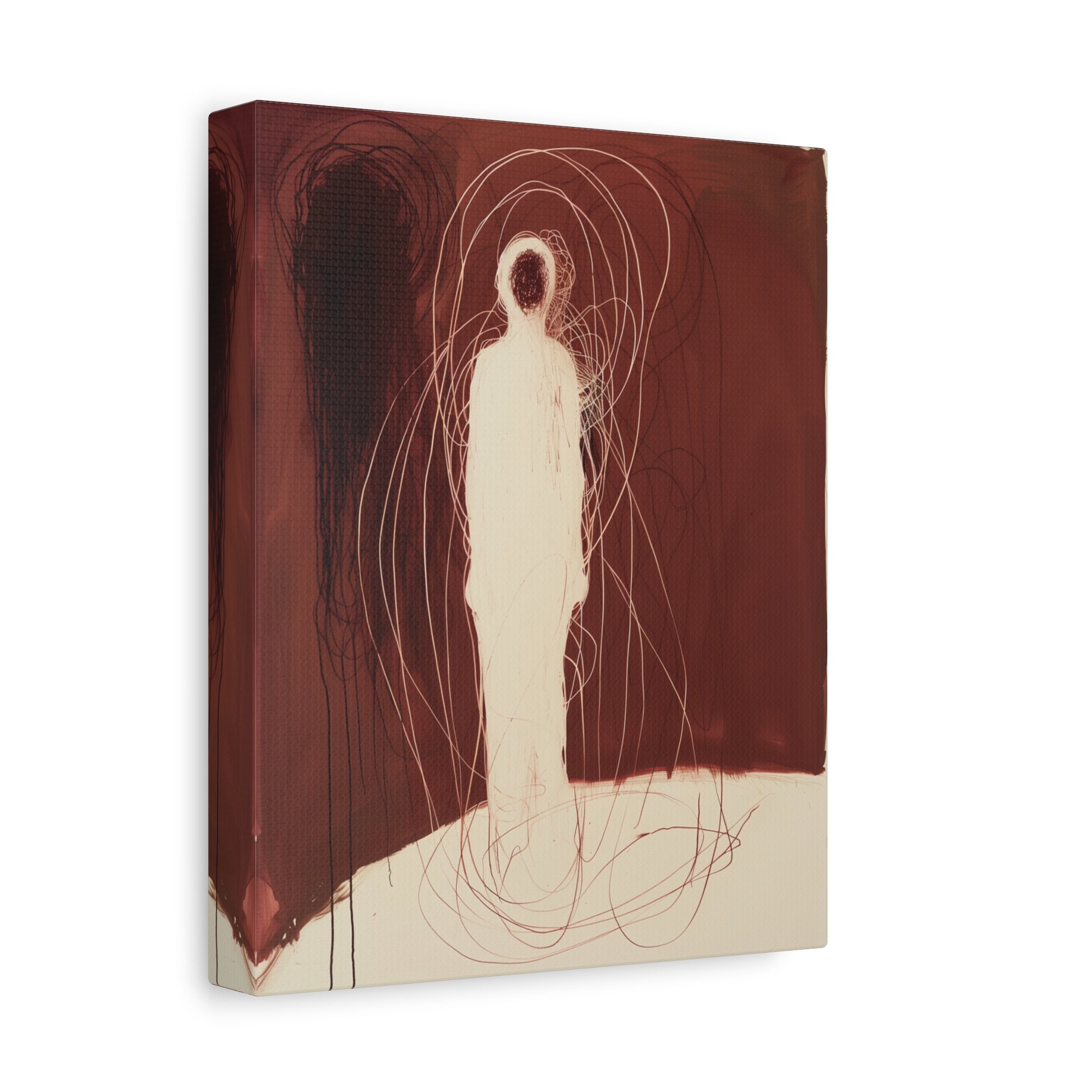 A spectral figure stands ensnared in a web of crimson threads, whispering secrets of shadows and silence. The tension between light and dark invites contemplation, drawing the viewer into its haunting embrace.